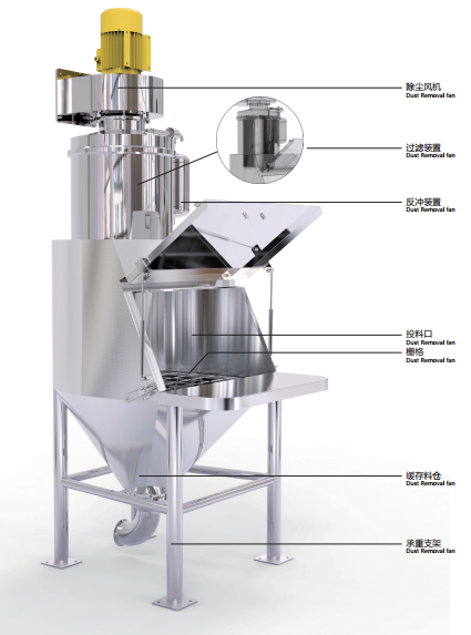 此設(shè)備采用新型集塵裝置,并配備振動(dòng)器輔助卸料,使整個(gè)投料過(guò)程中無(wú)粉塵、順暢、不浪費(fèi)物料,是目前國(guó)內(nèi)最為理想的人工投料站設(shè)備。